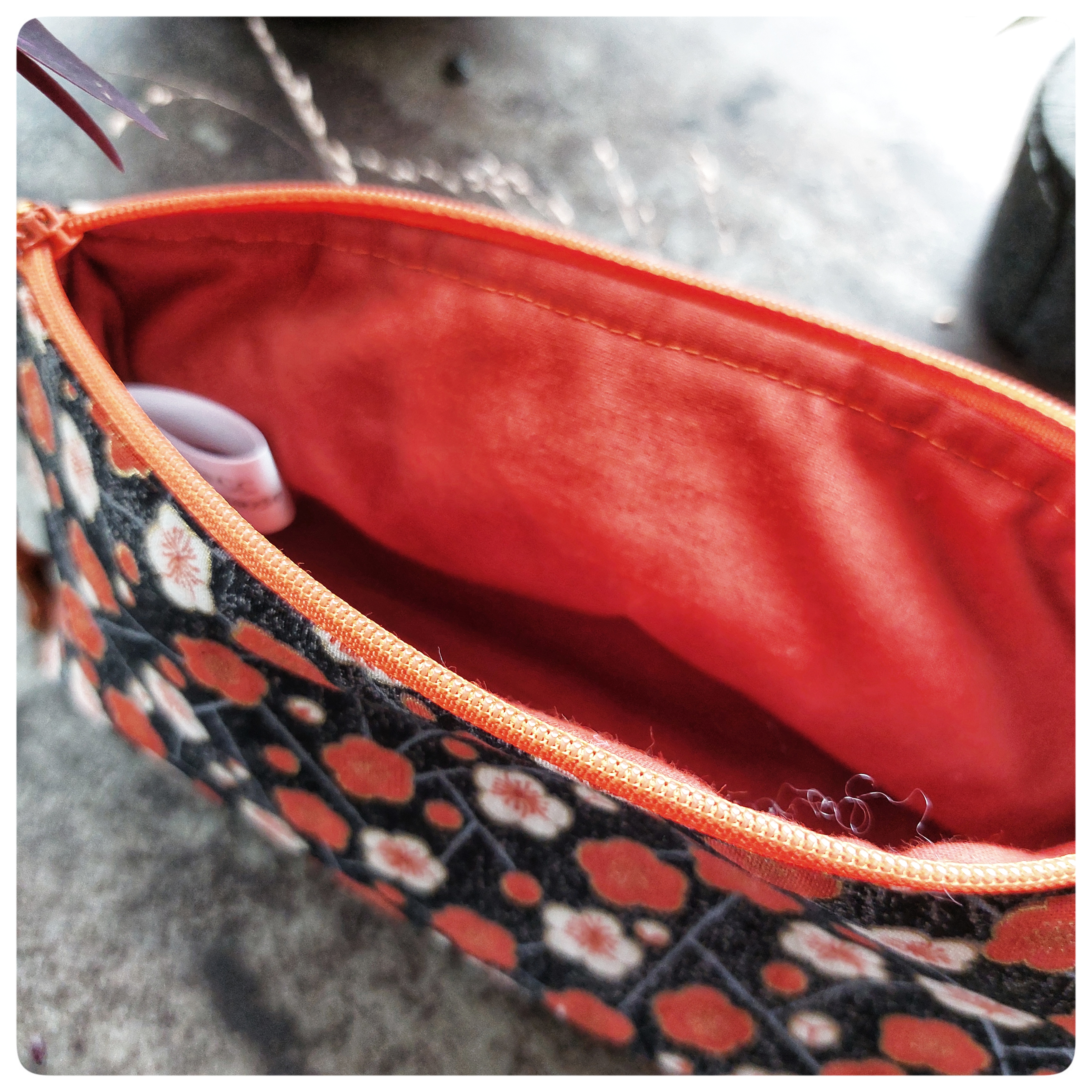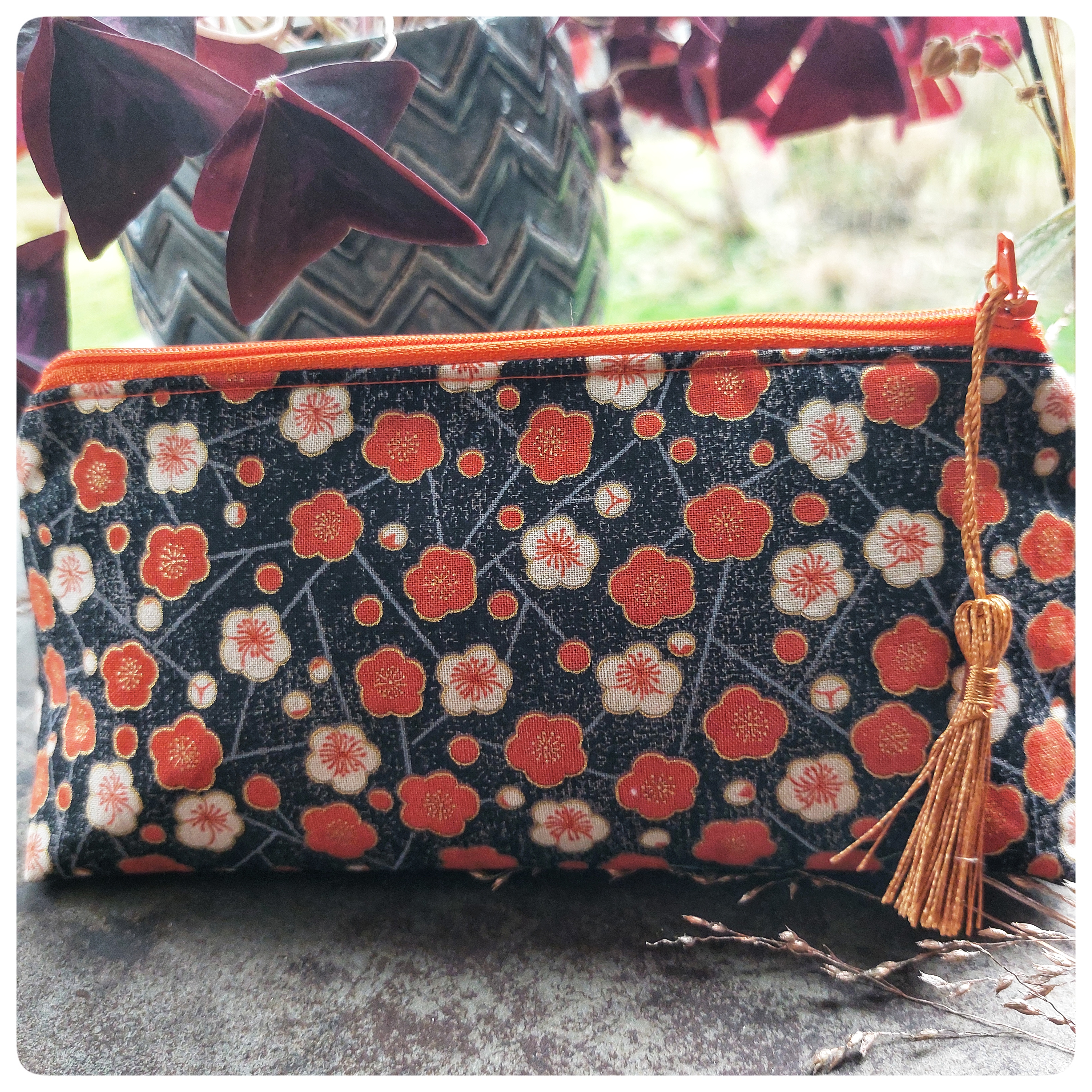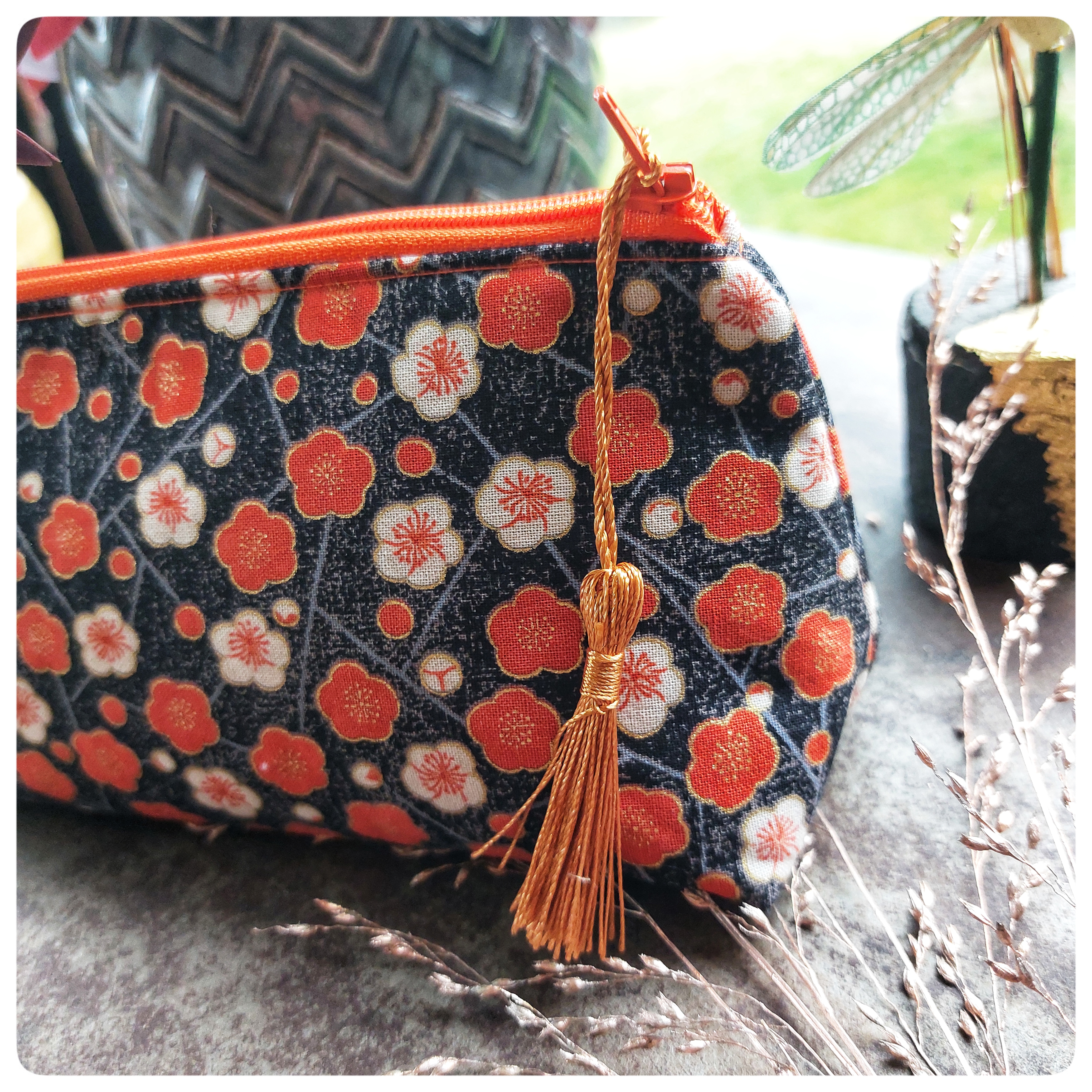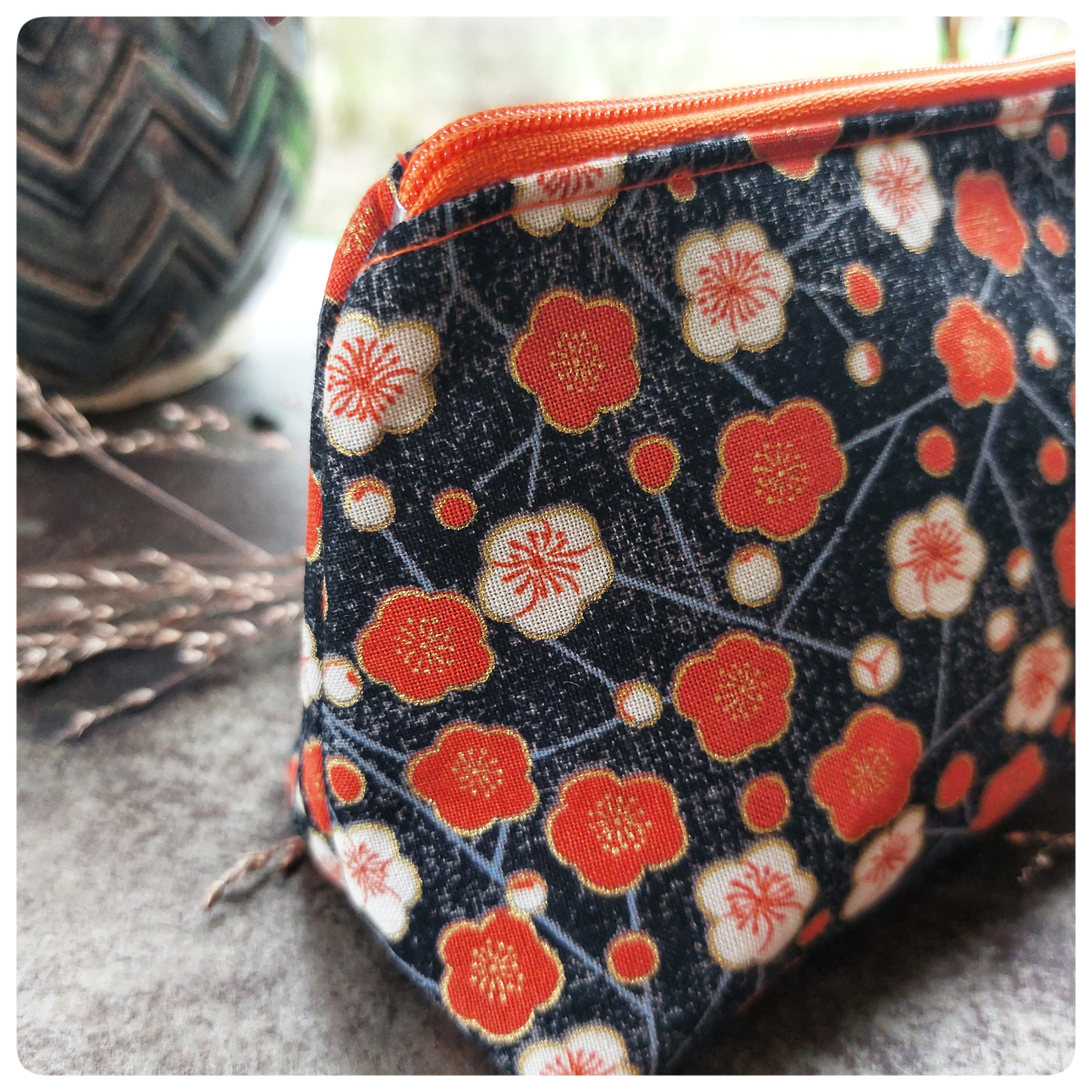 Trousse triangulaire tissu japonais noir orange fleurs