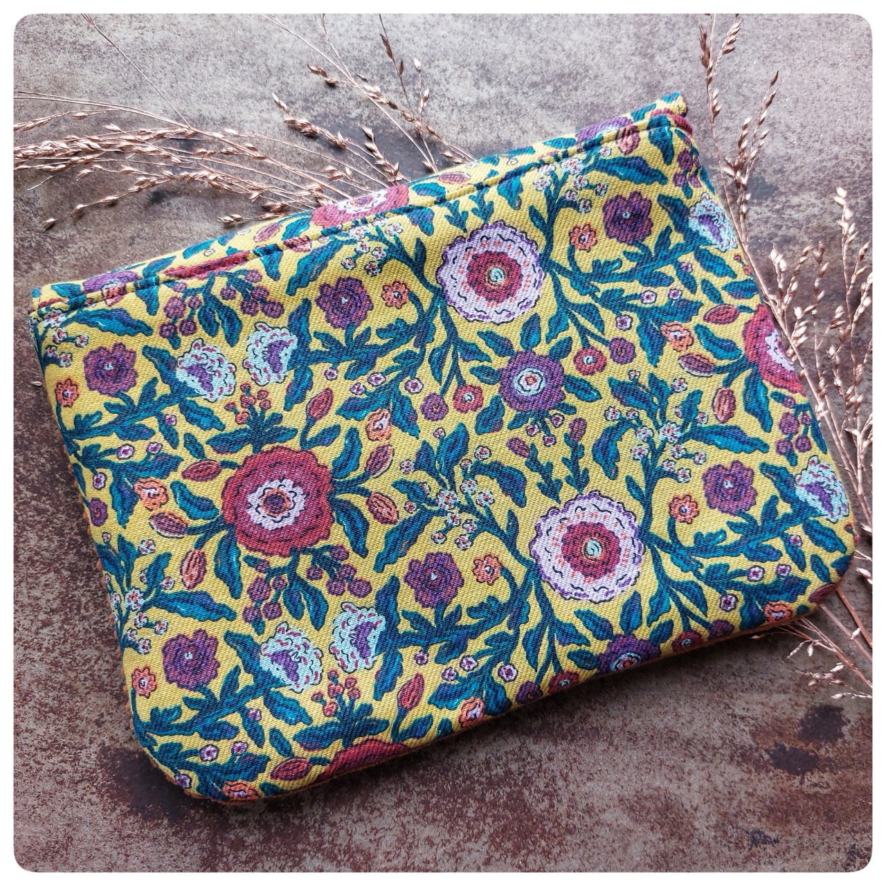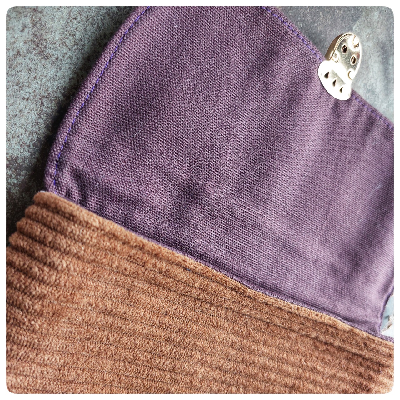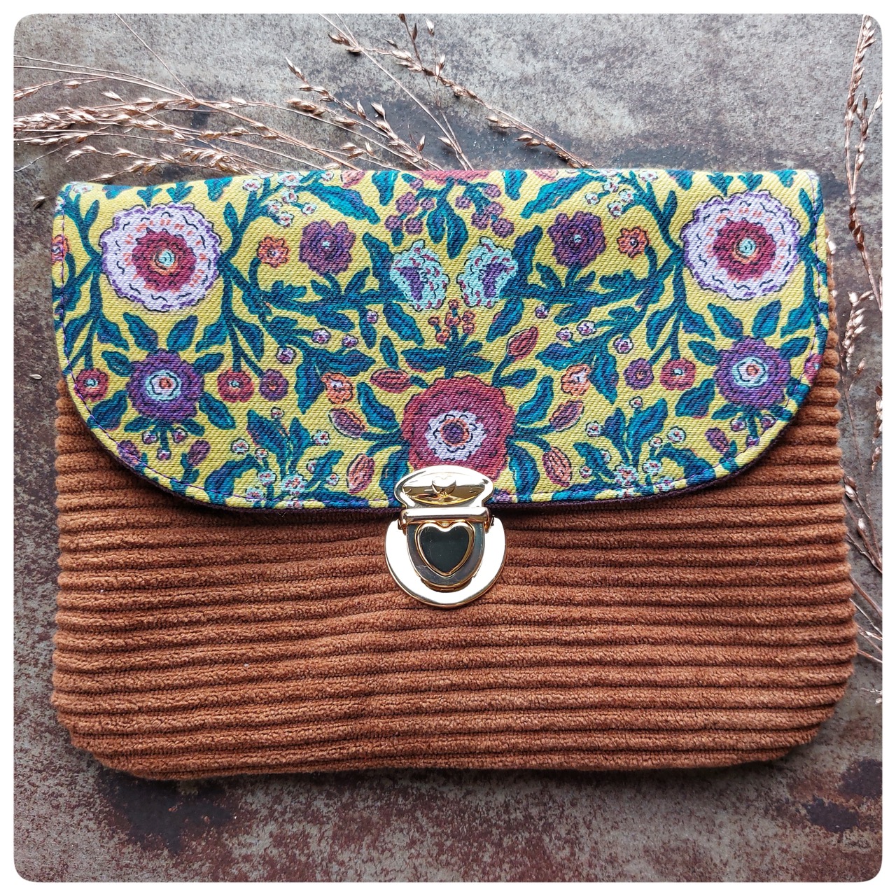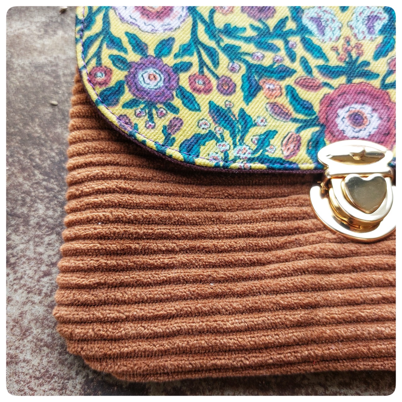 Pochette à fermoir cartable velours marron et coton fleuri