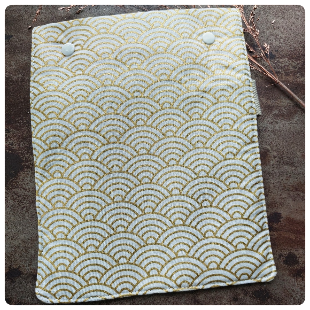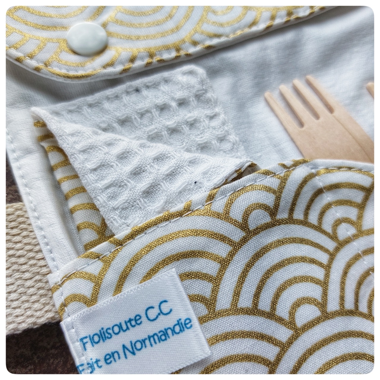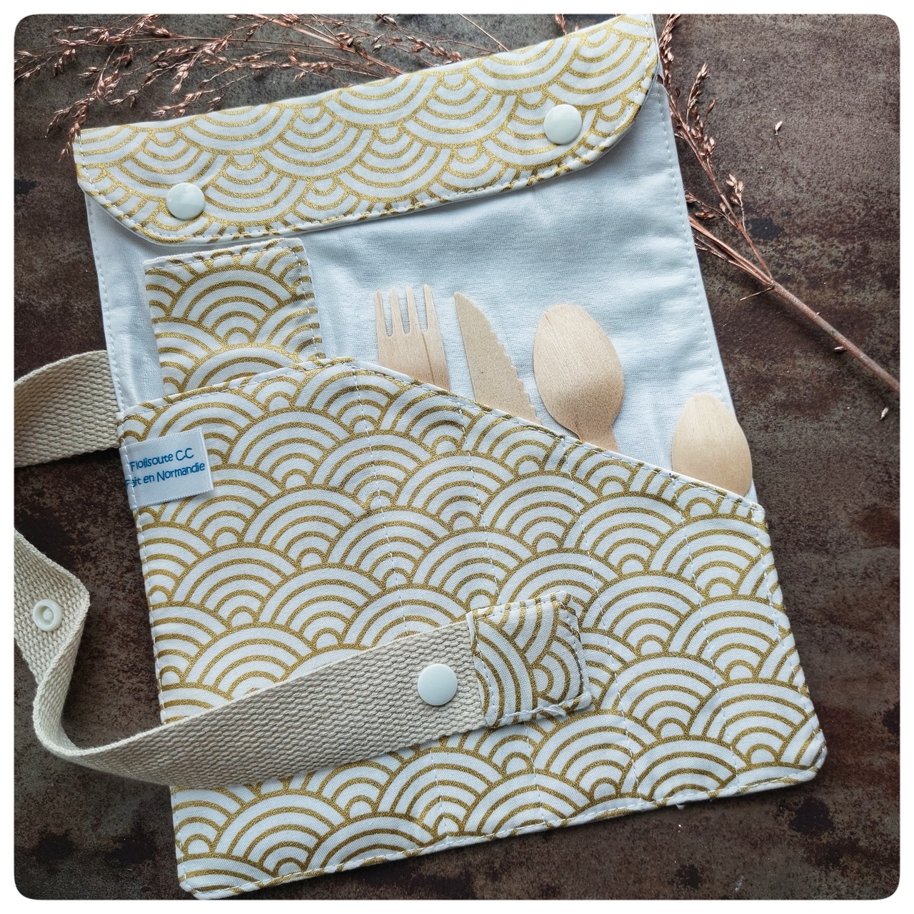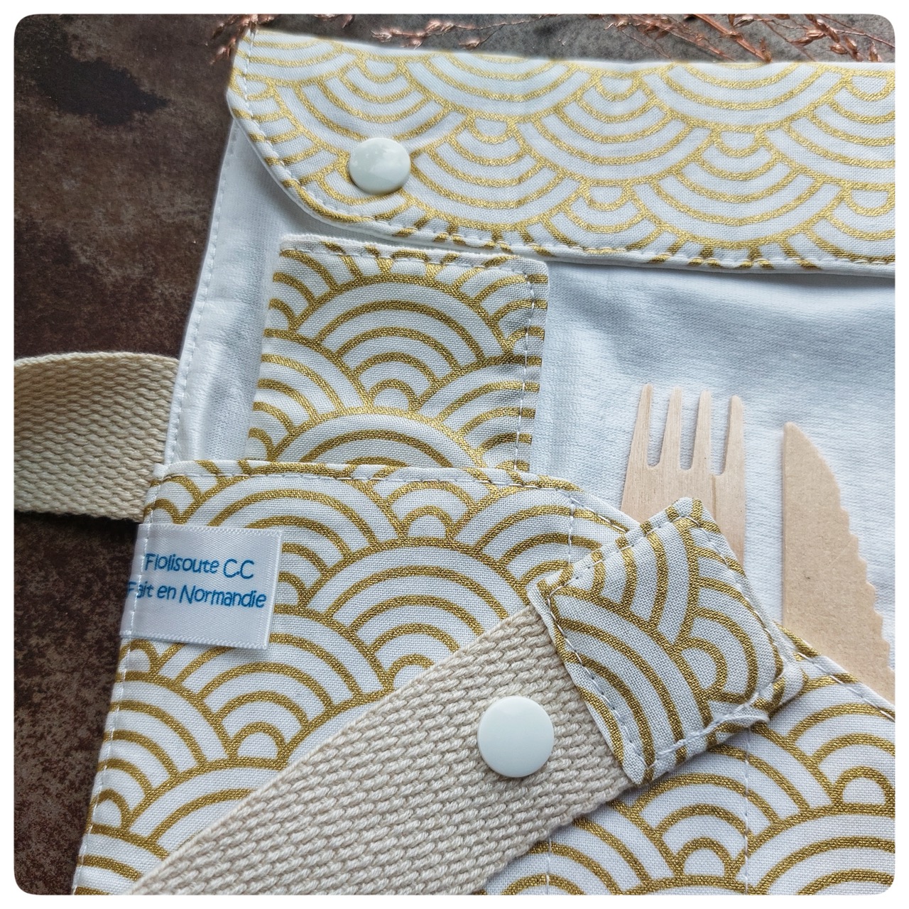 Pochette couvert pique-nique tissu japonais doré blanc