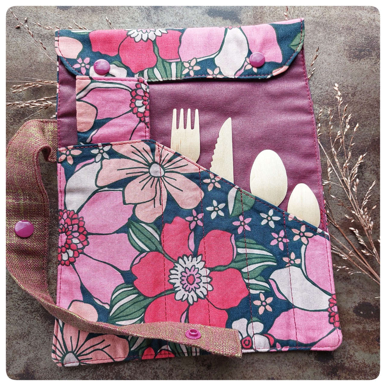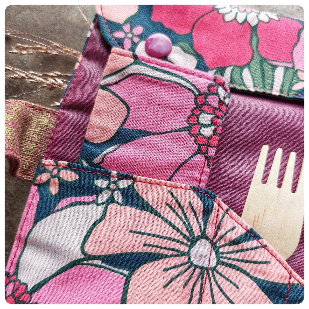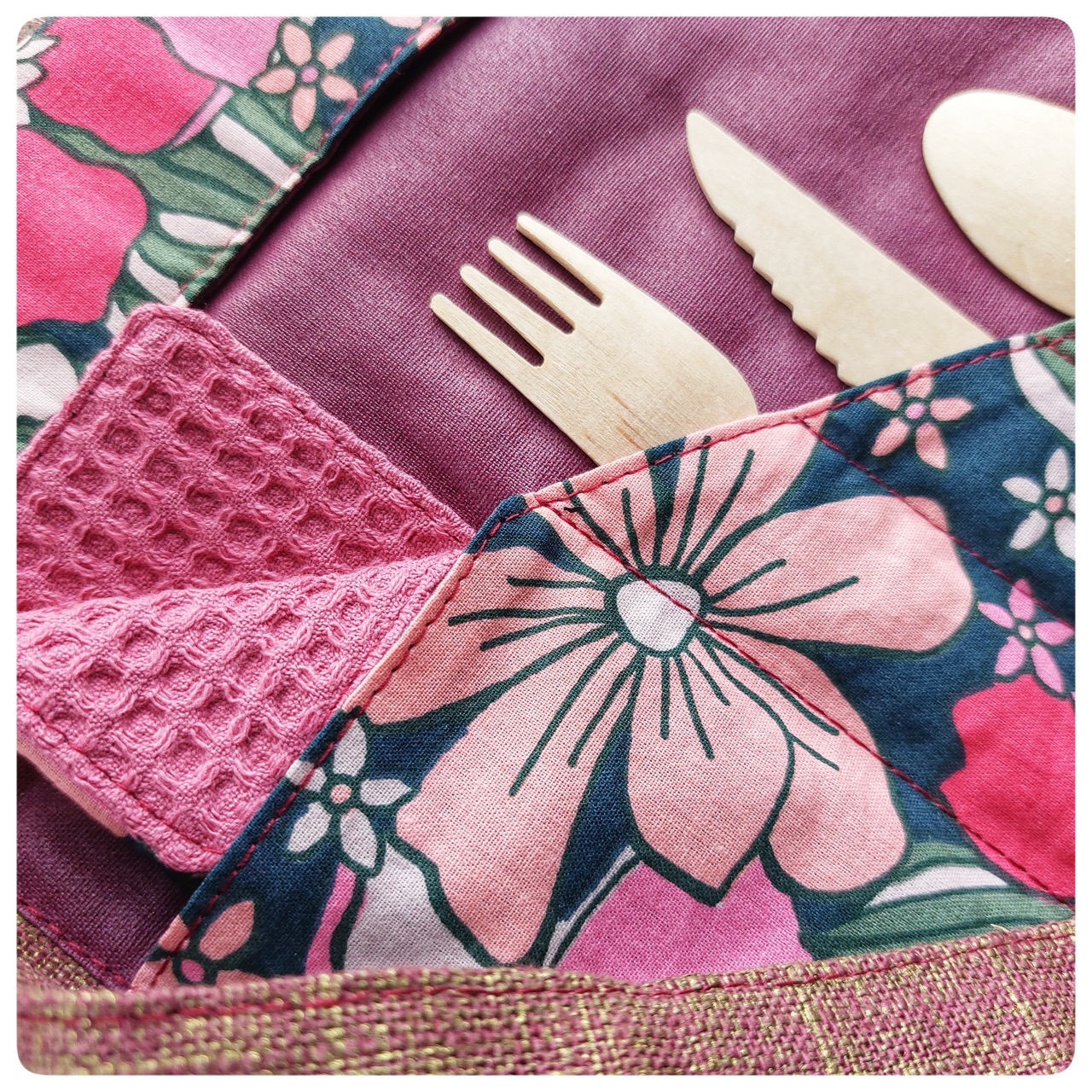 Pochette couvert pique-nique tissu coton fleuri rose