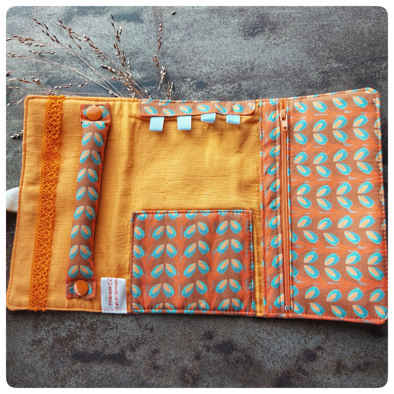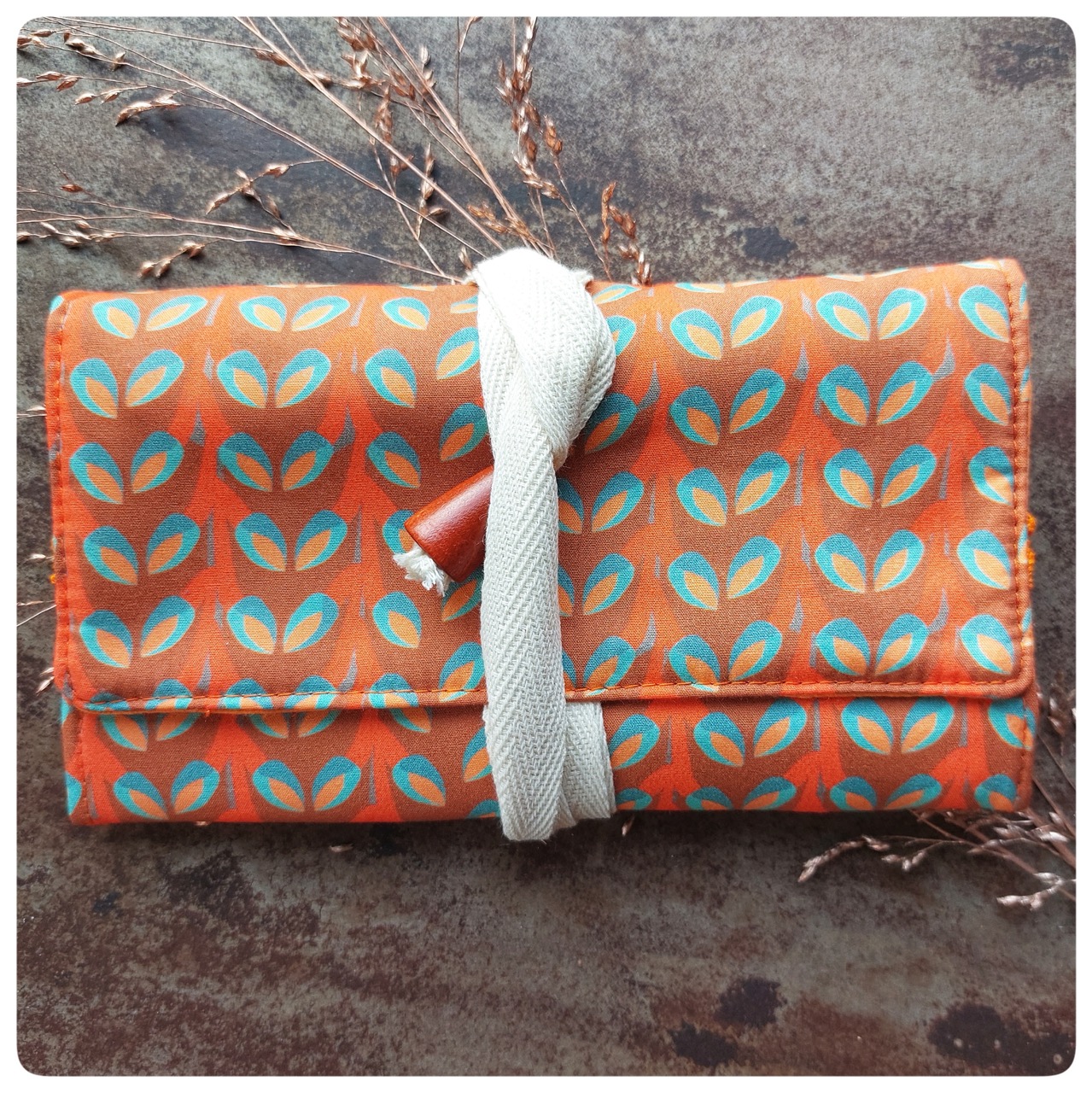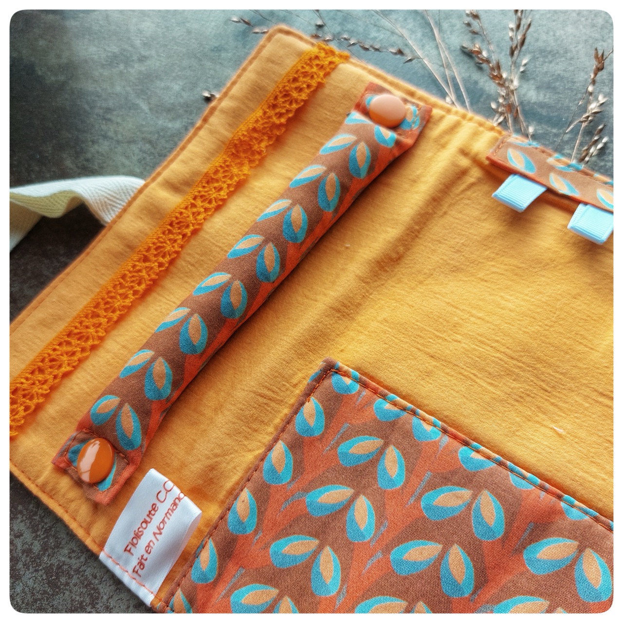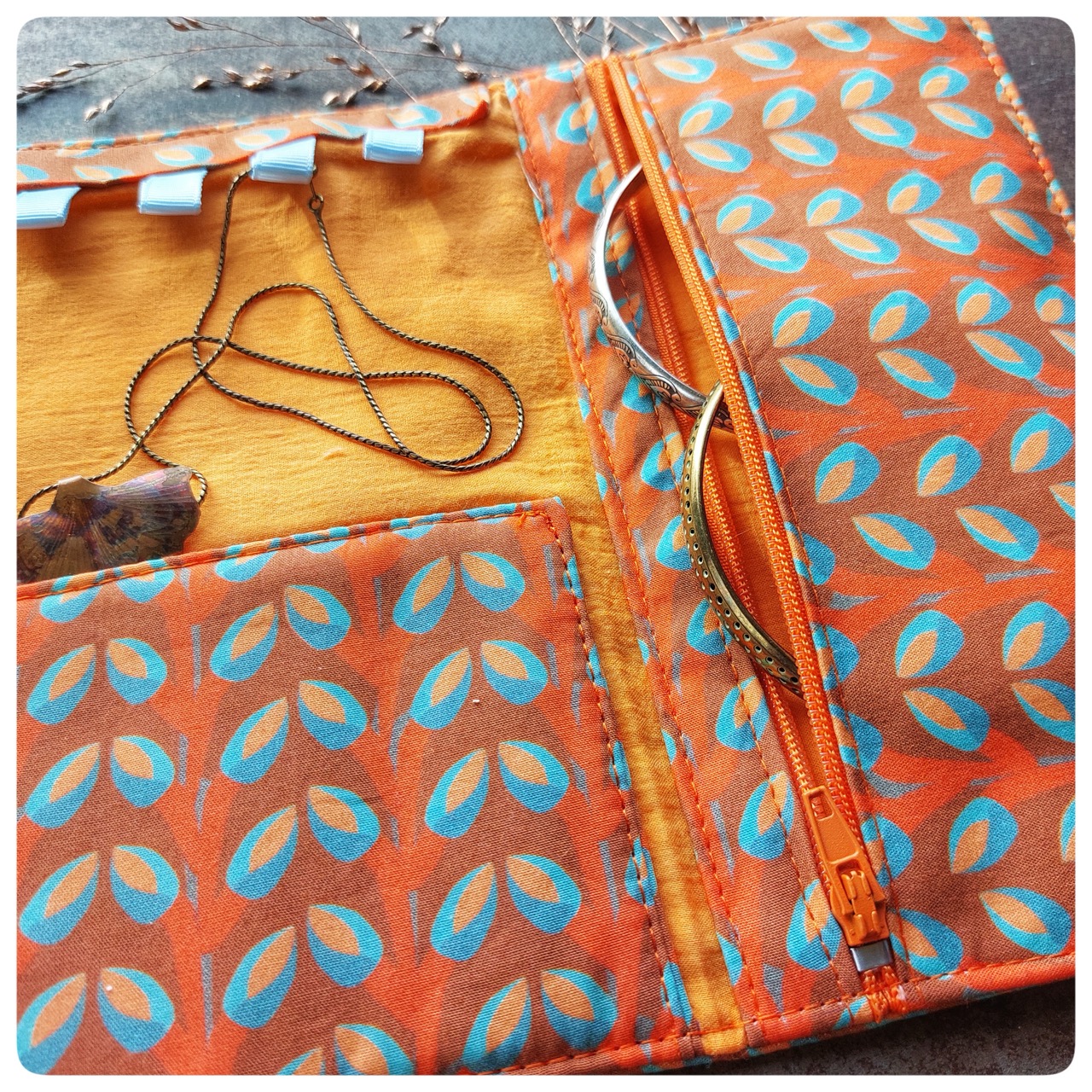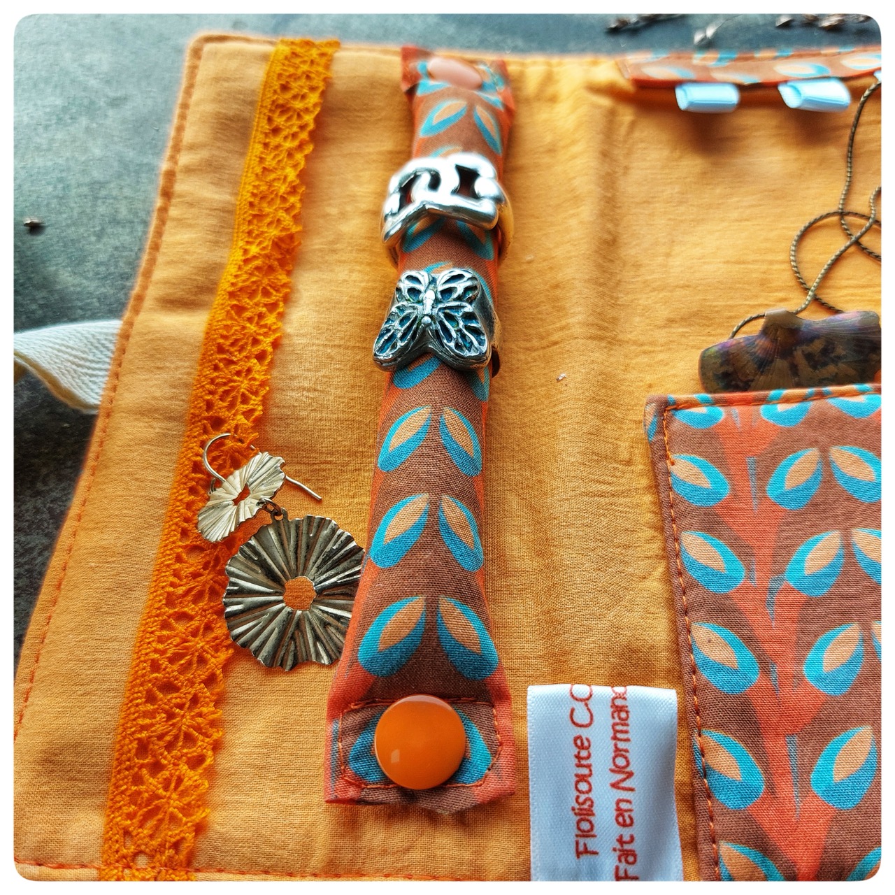 Pochette à bijoux en tissu vintage orange fleurs bleue