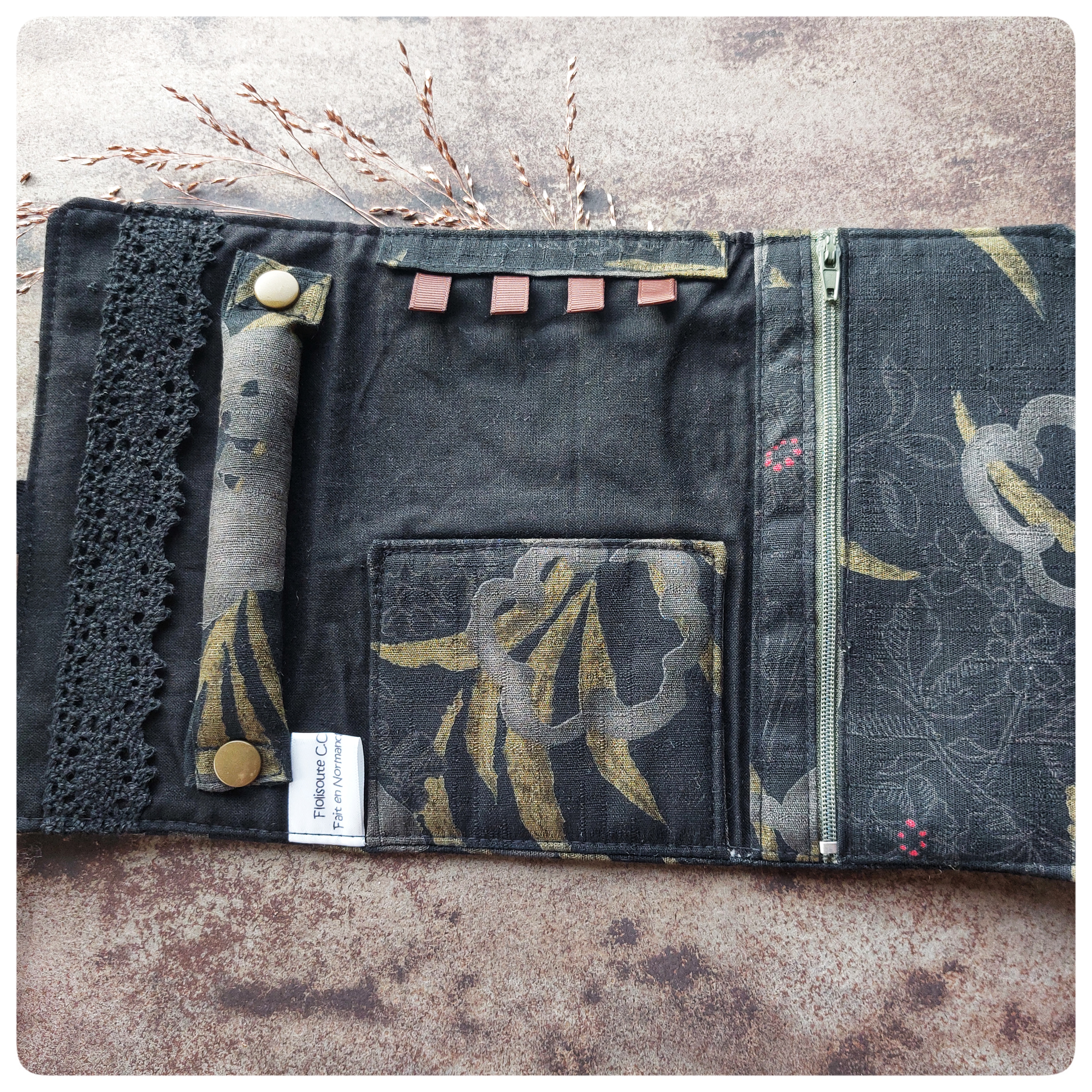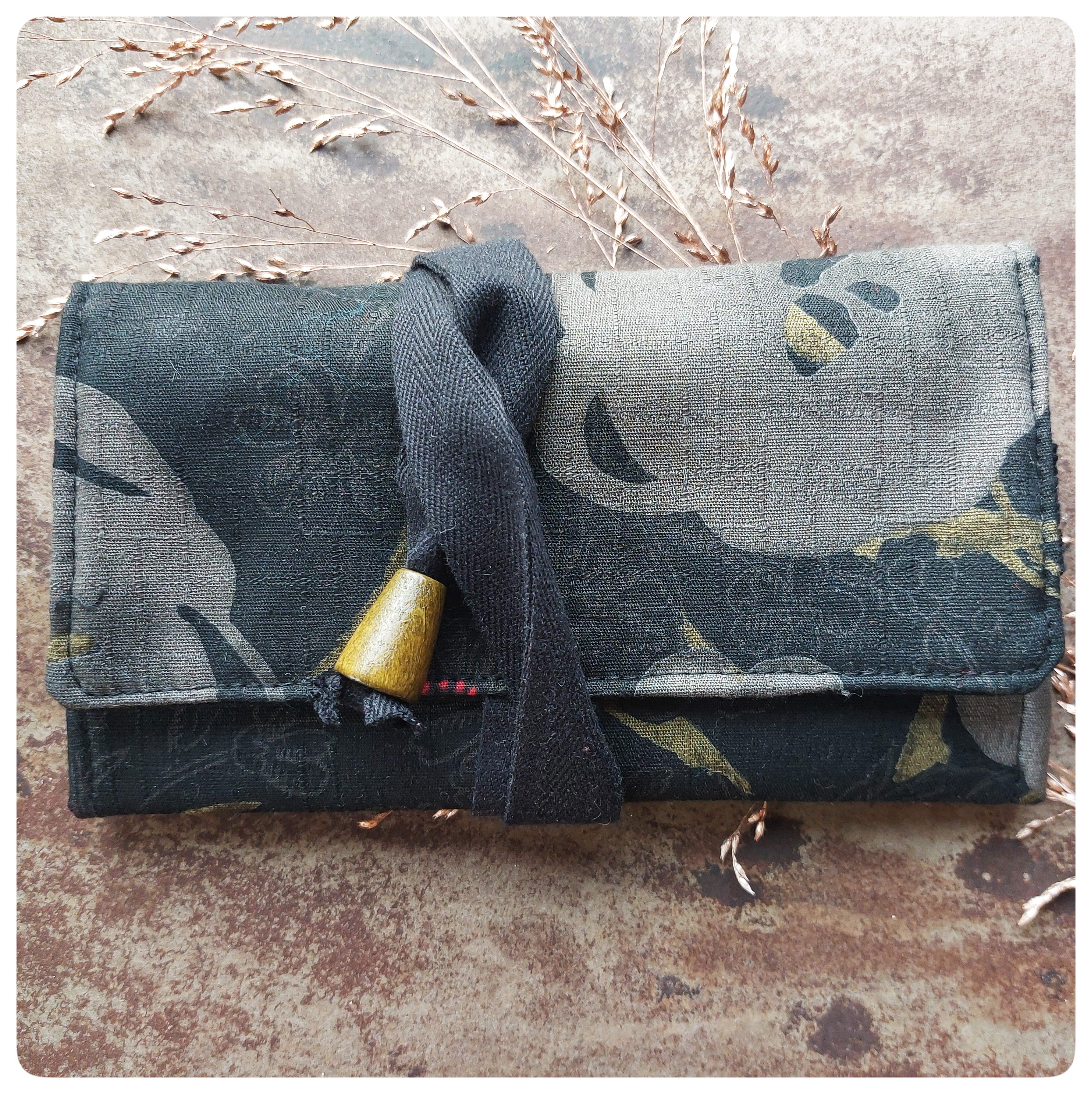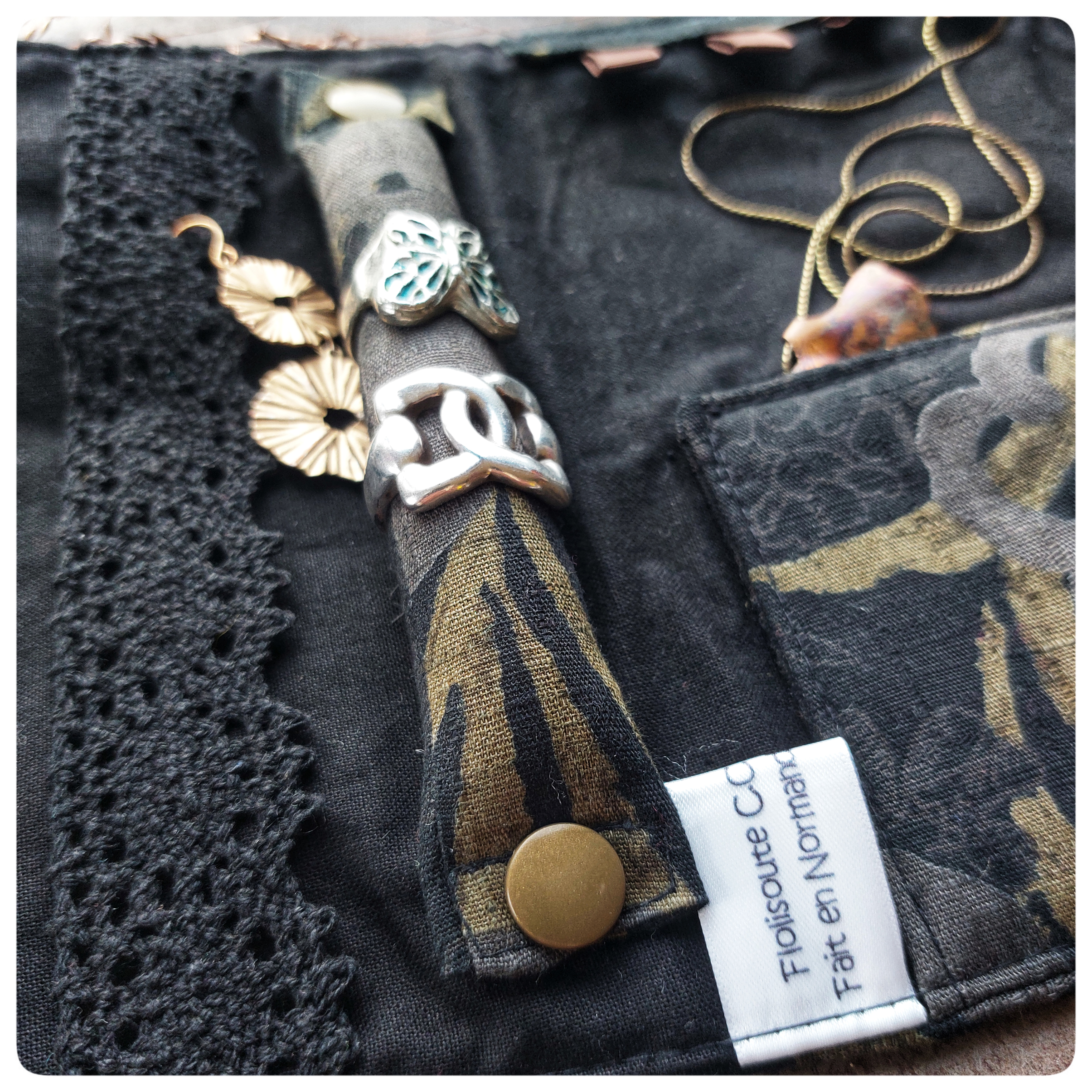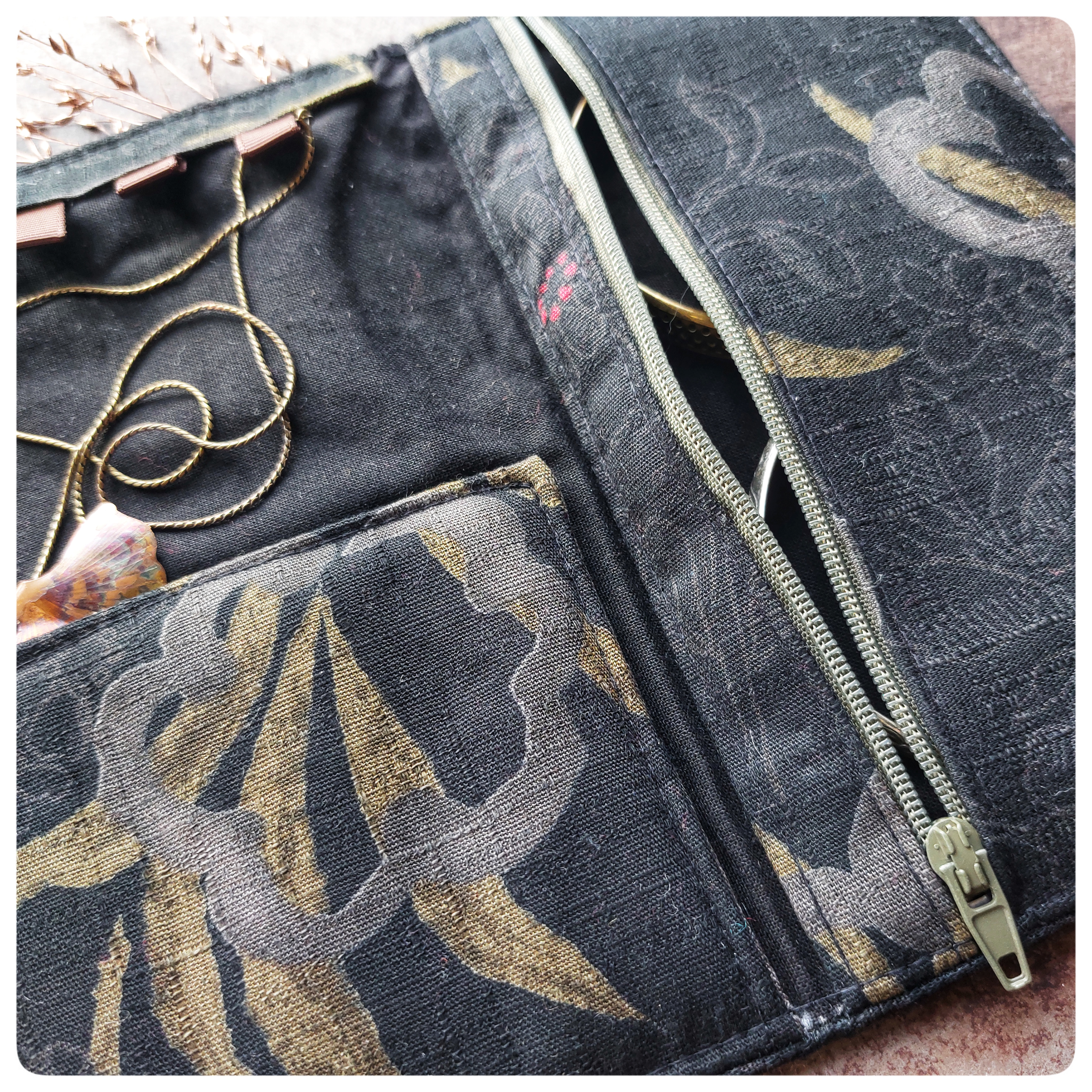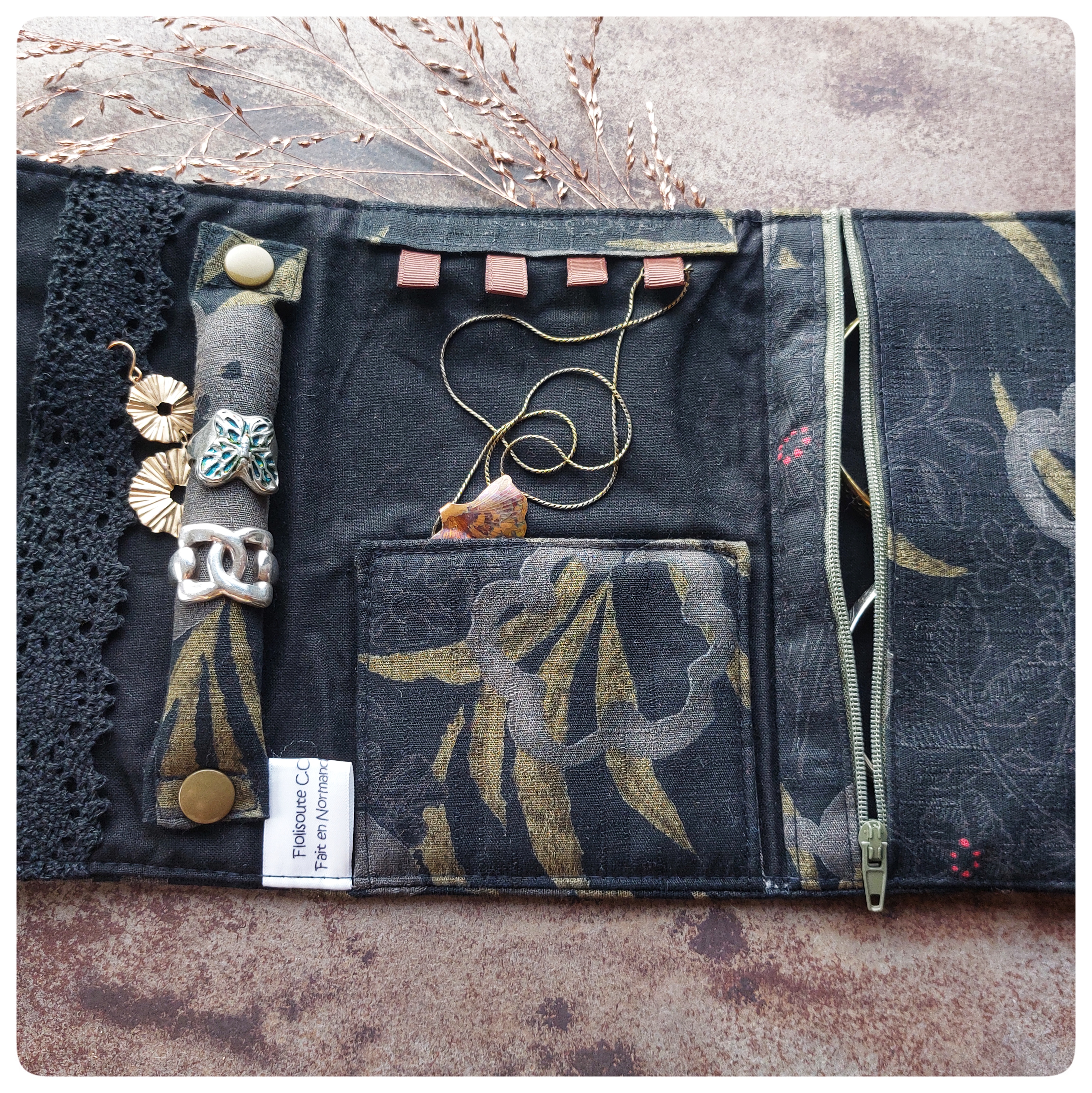 Pochette à bijoux en tissu japonais noir fleurs kaki