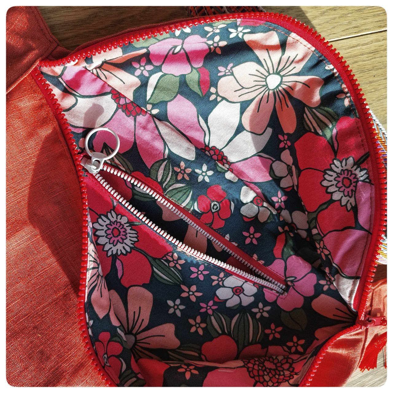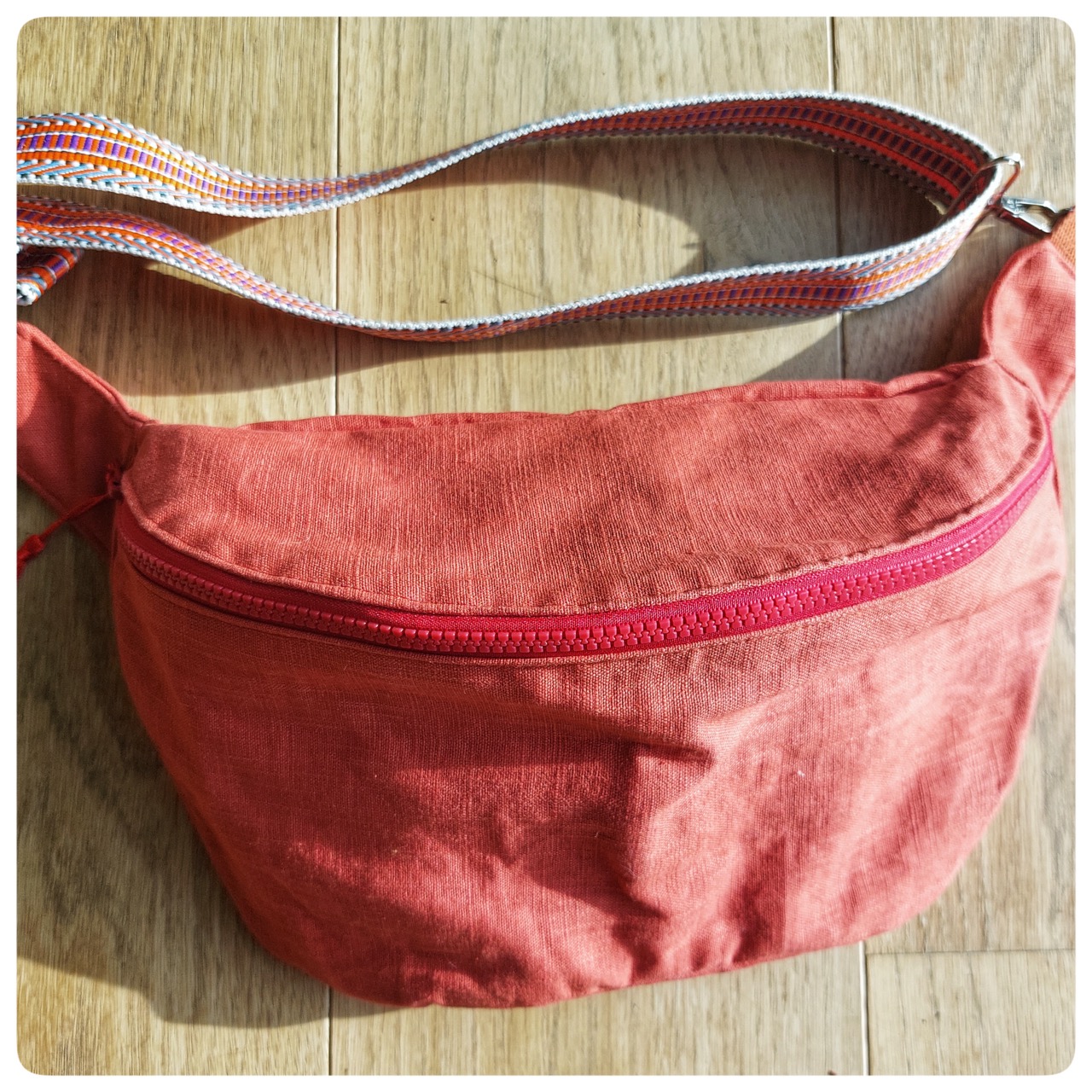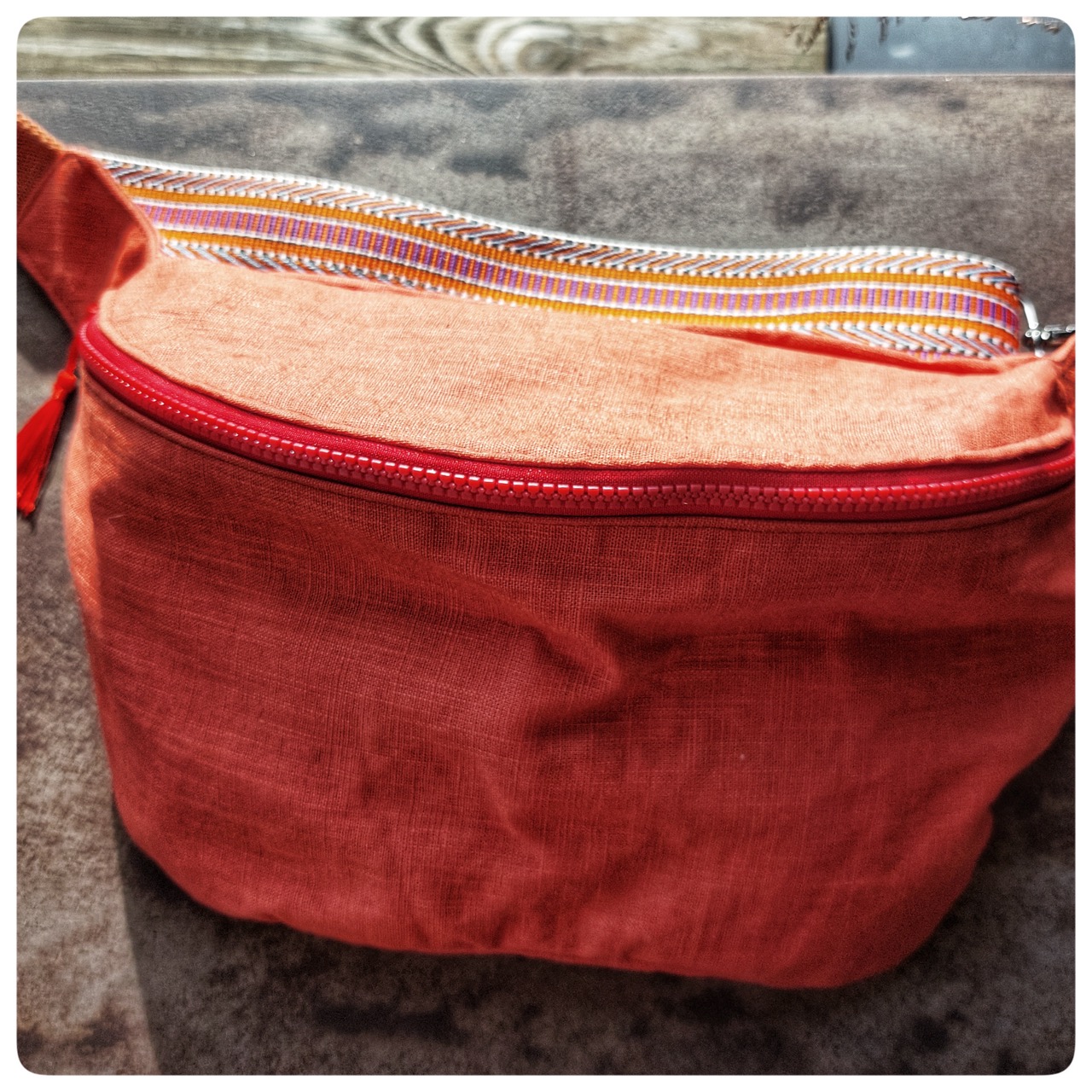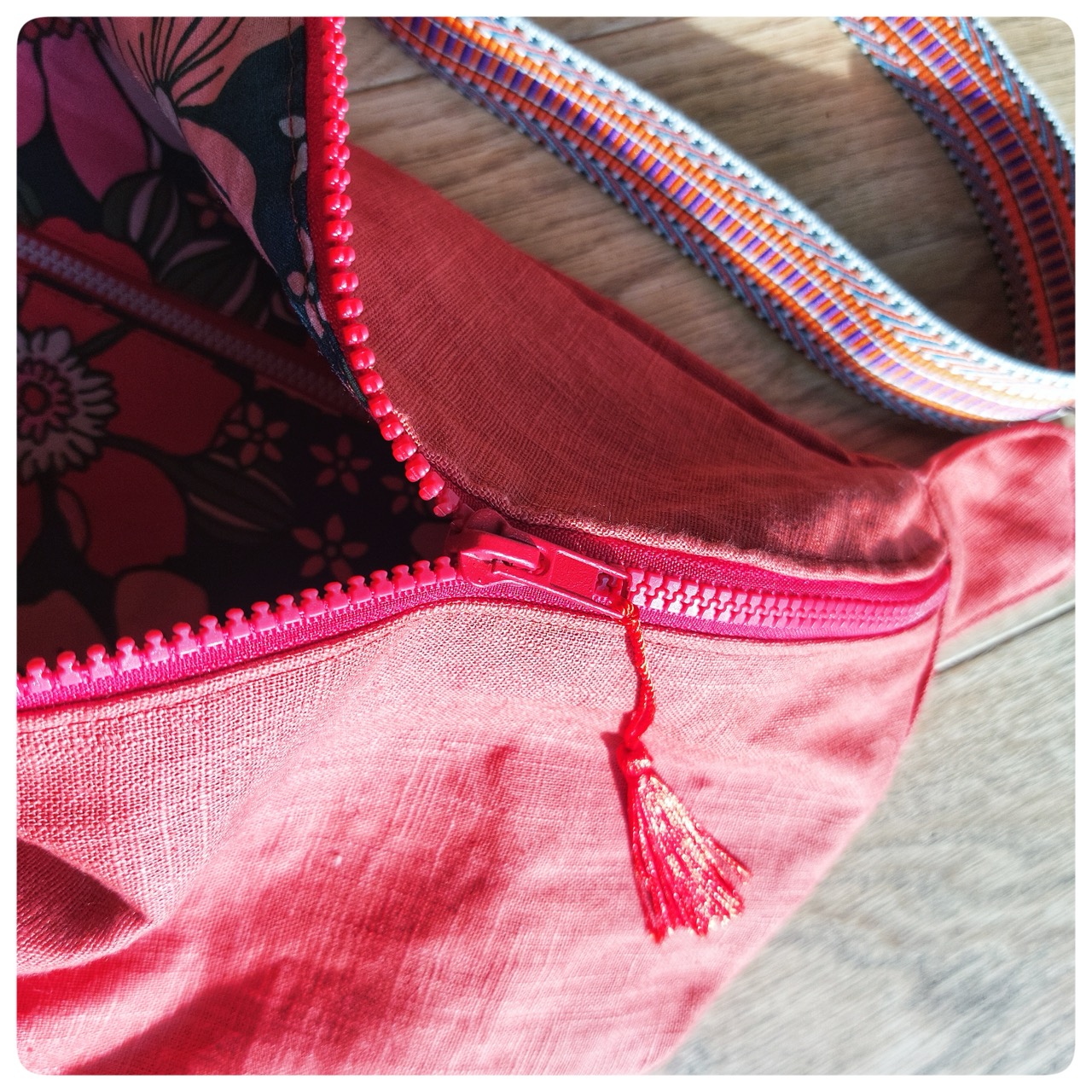 Sac banane Grand Format Tissu lin lavé corail et tissu fleuri