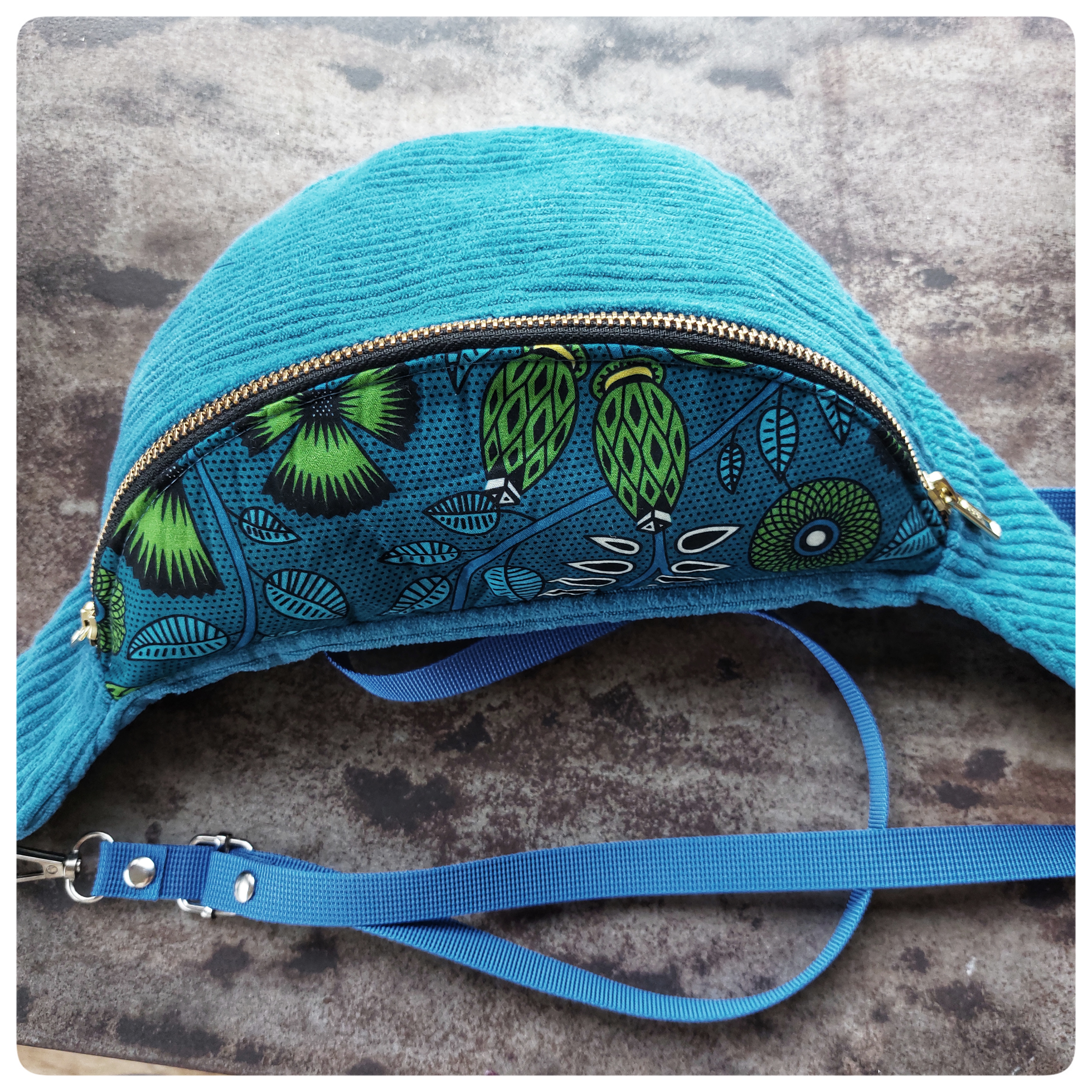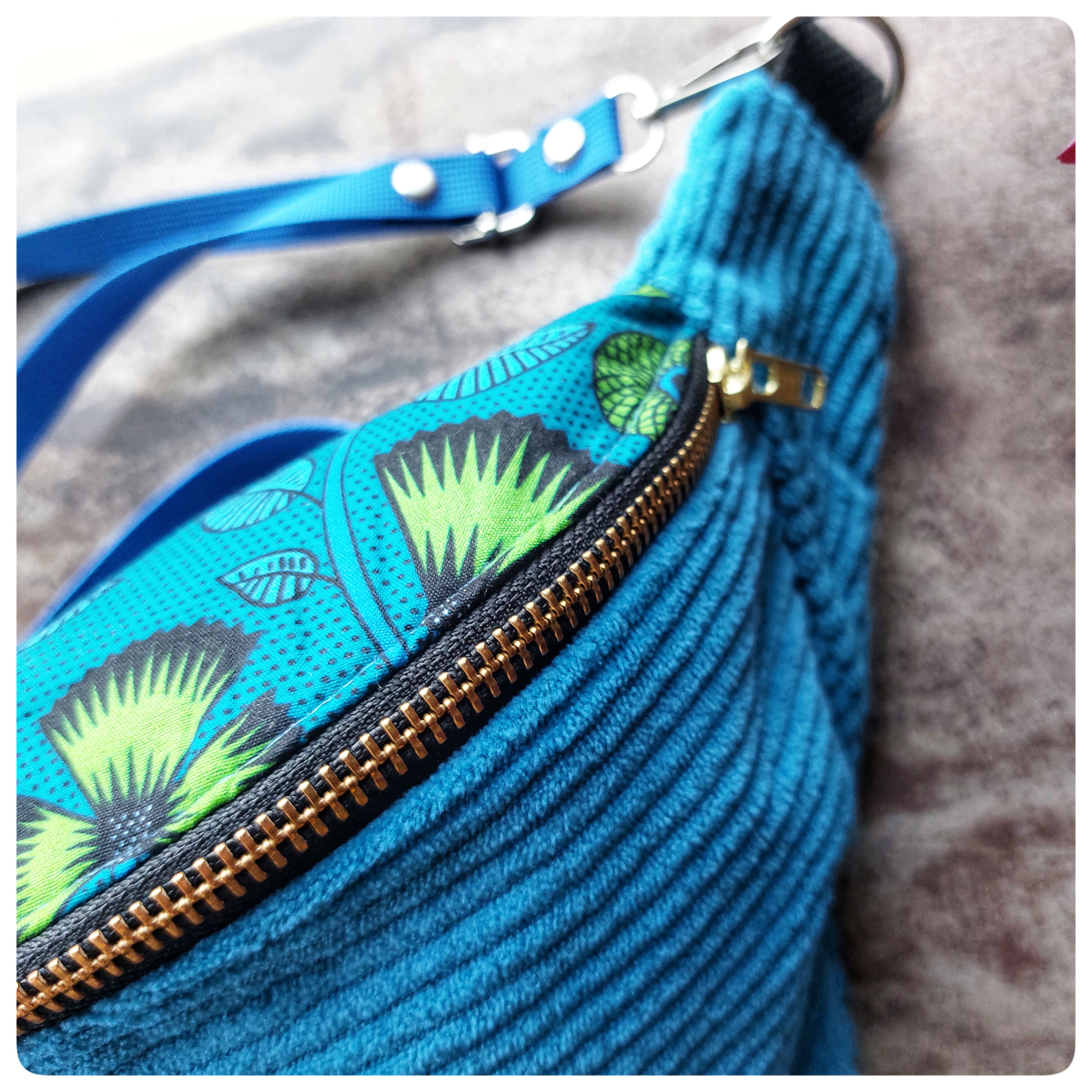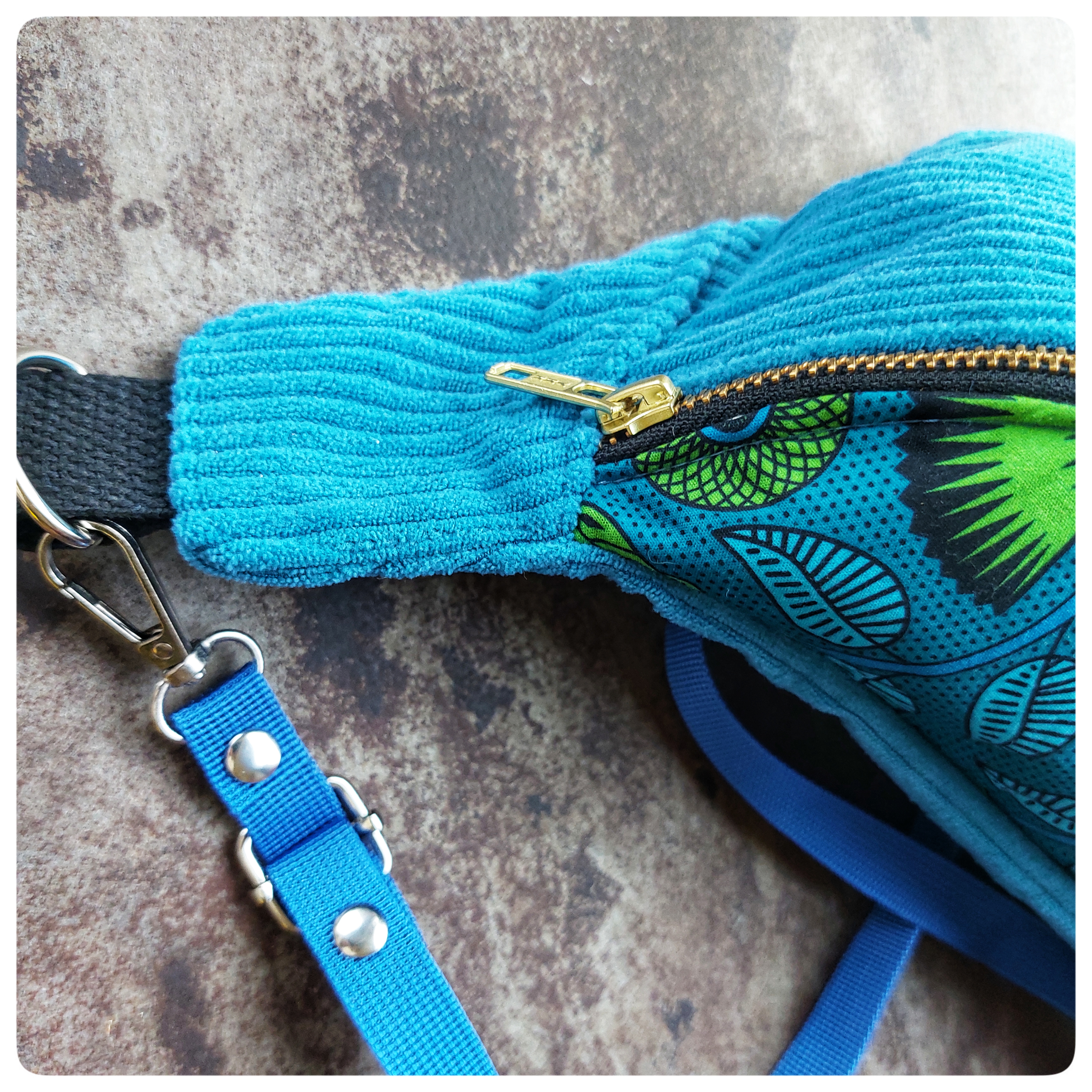 Sac banane Petit Format Velours bleu et tissu coton vert bleu