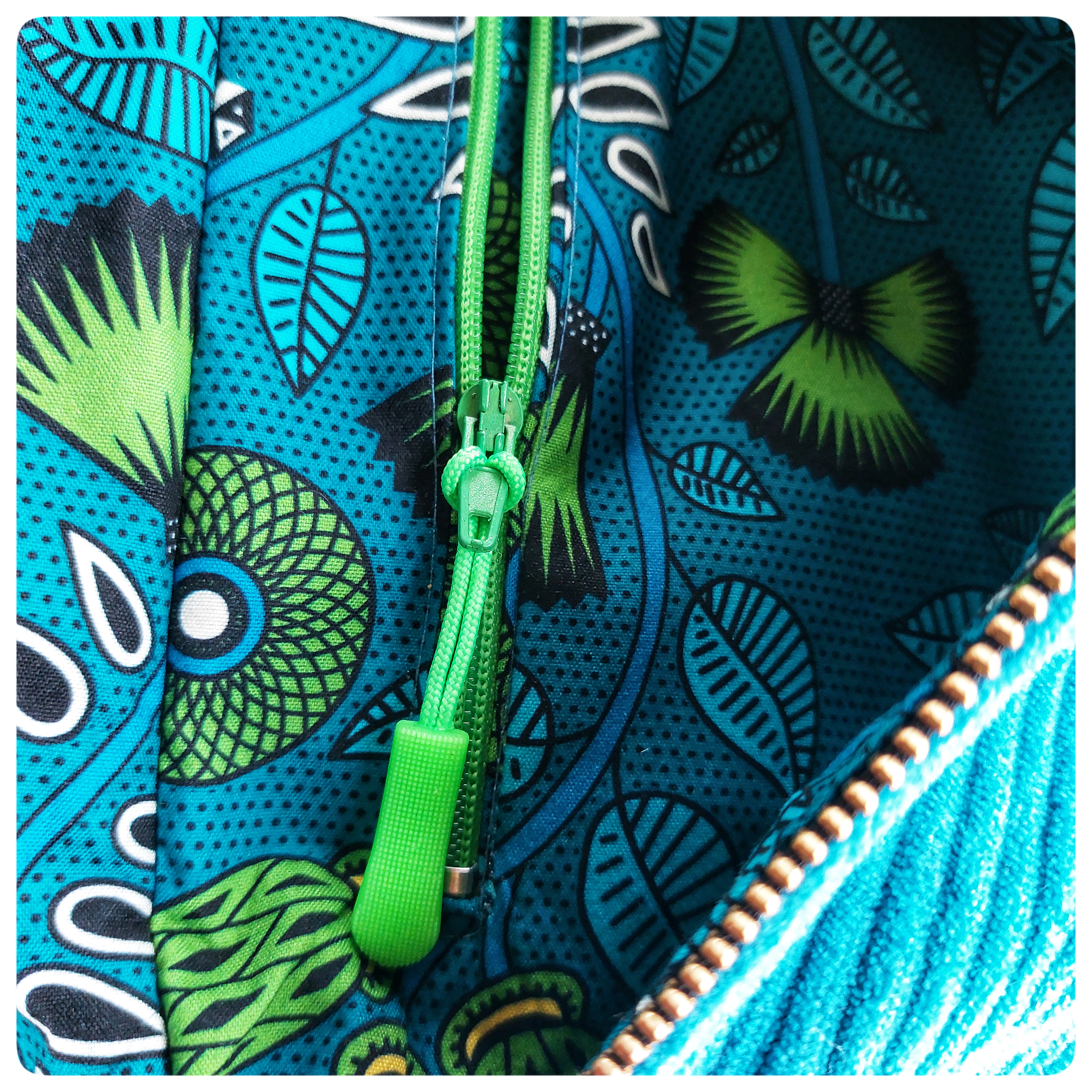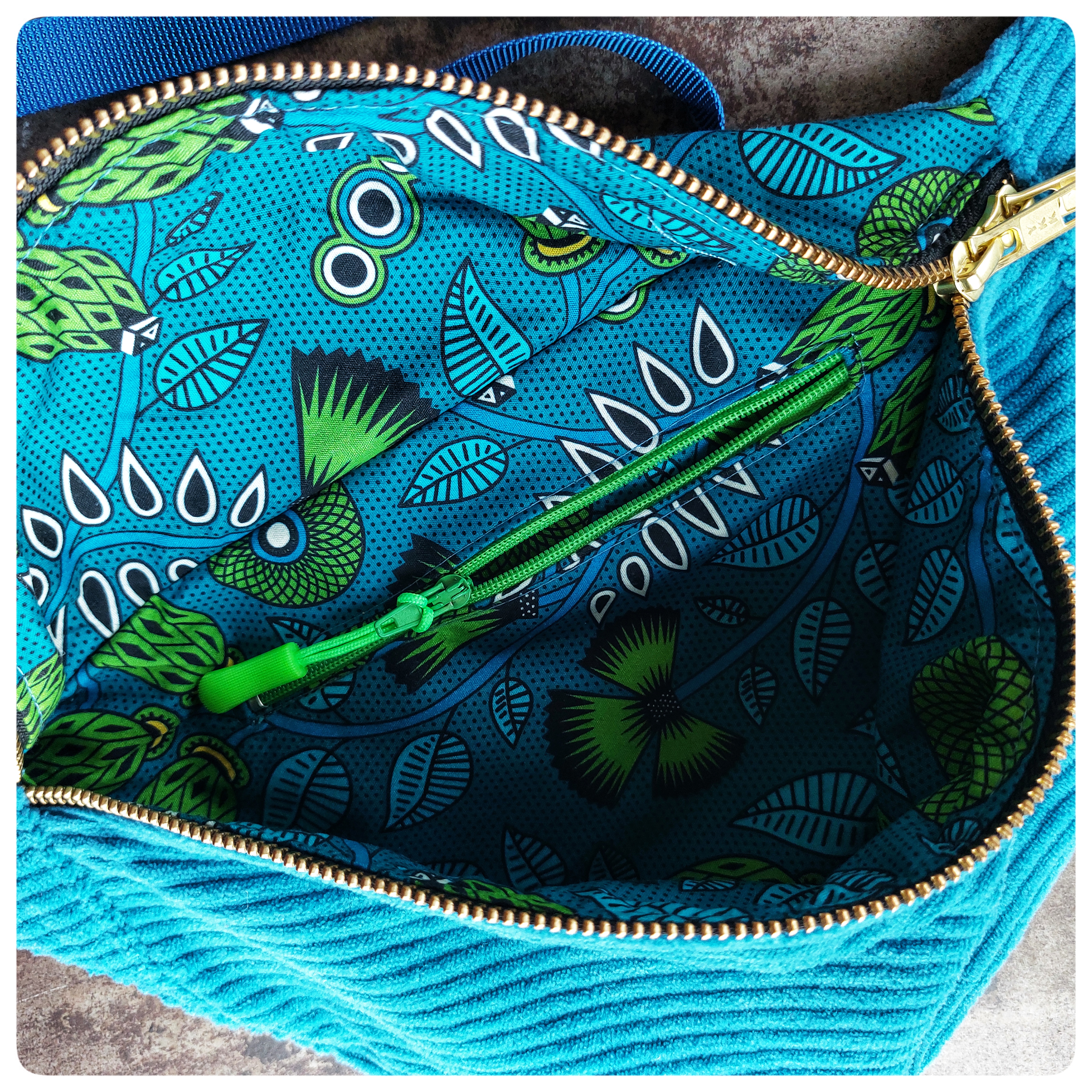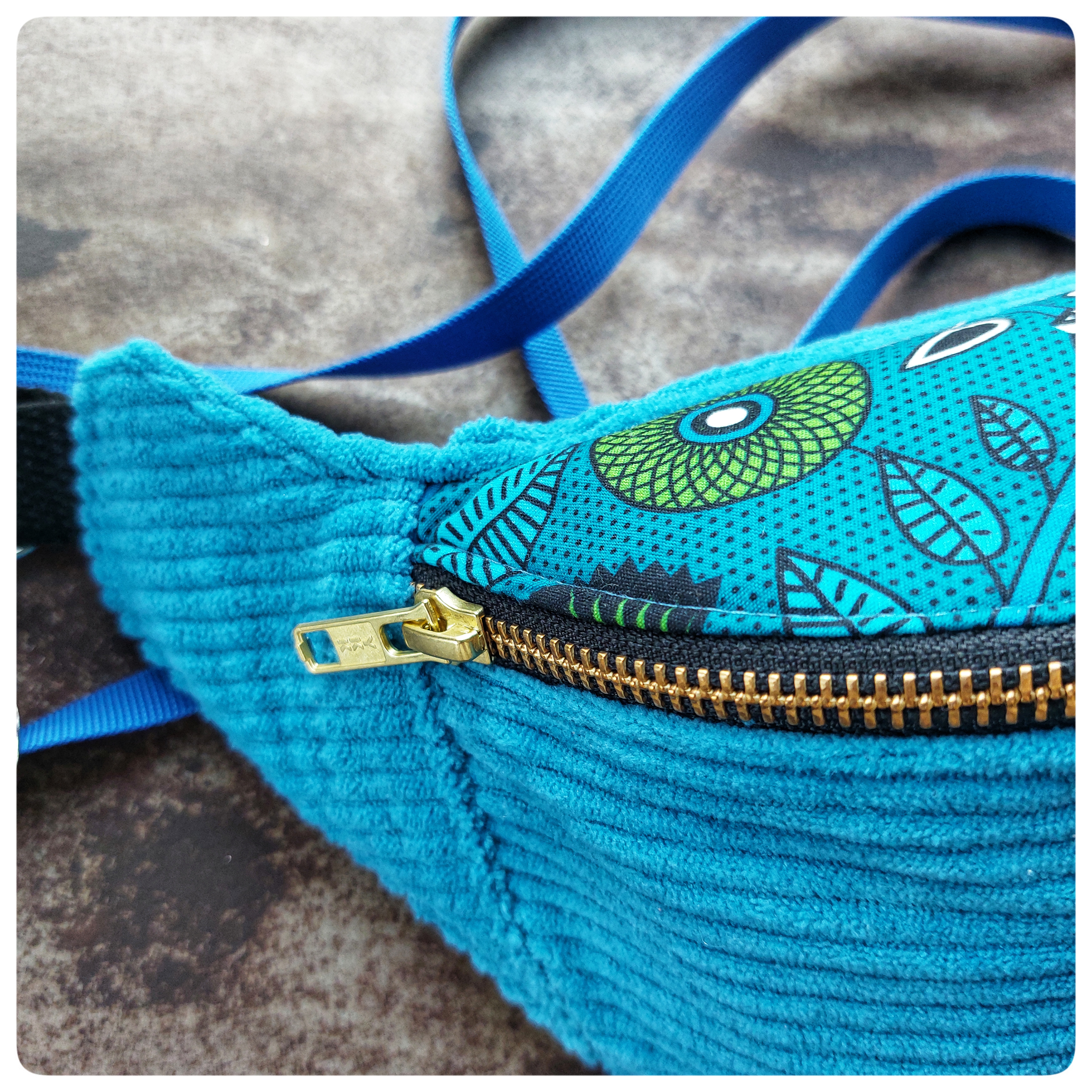 Sac banane Petit Format Velours bleu et tissu coton vert bleu