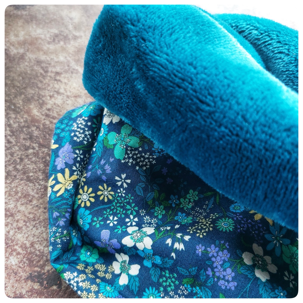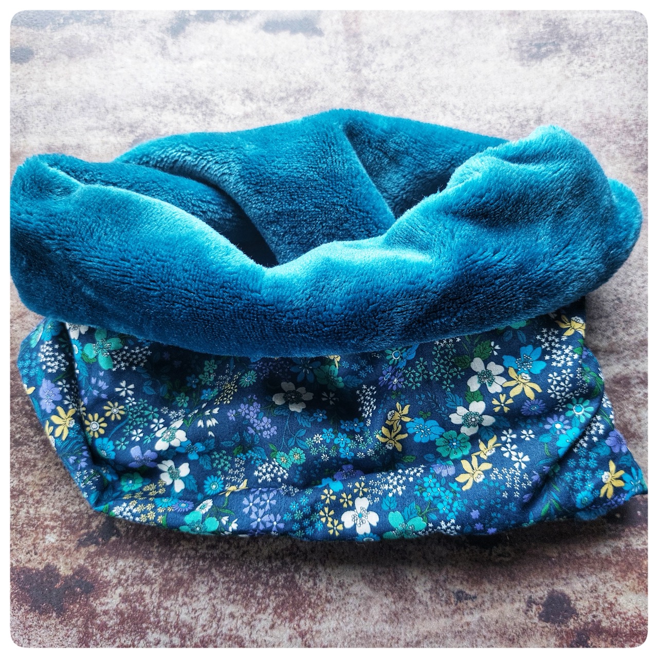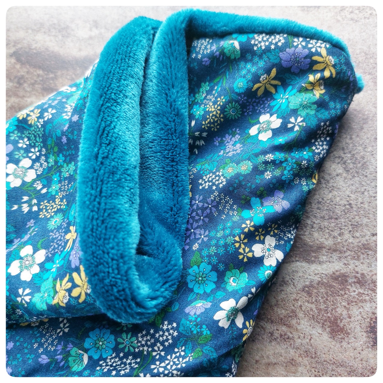 Snood pour enfant en tissu coton imprimé fleuris et fourrure bleu turquoise
