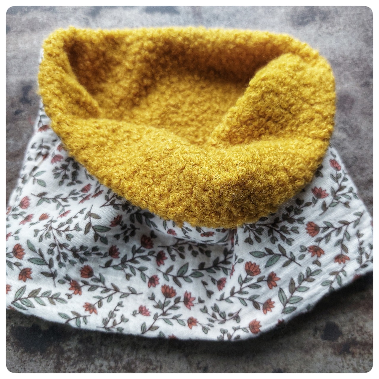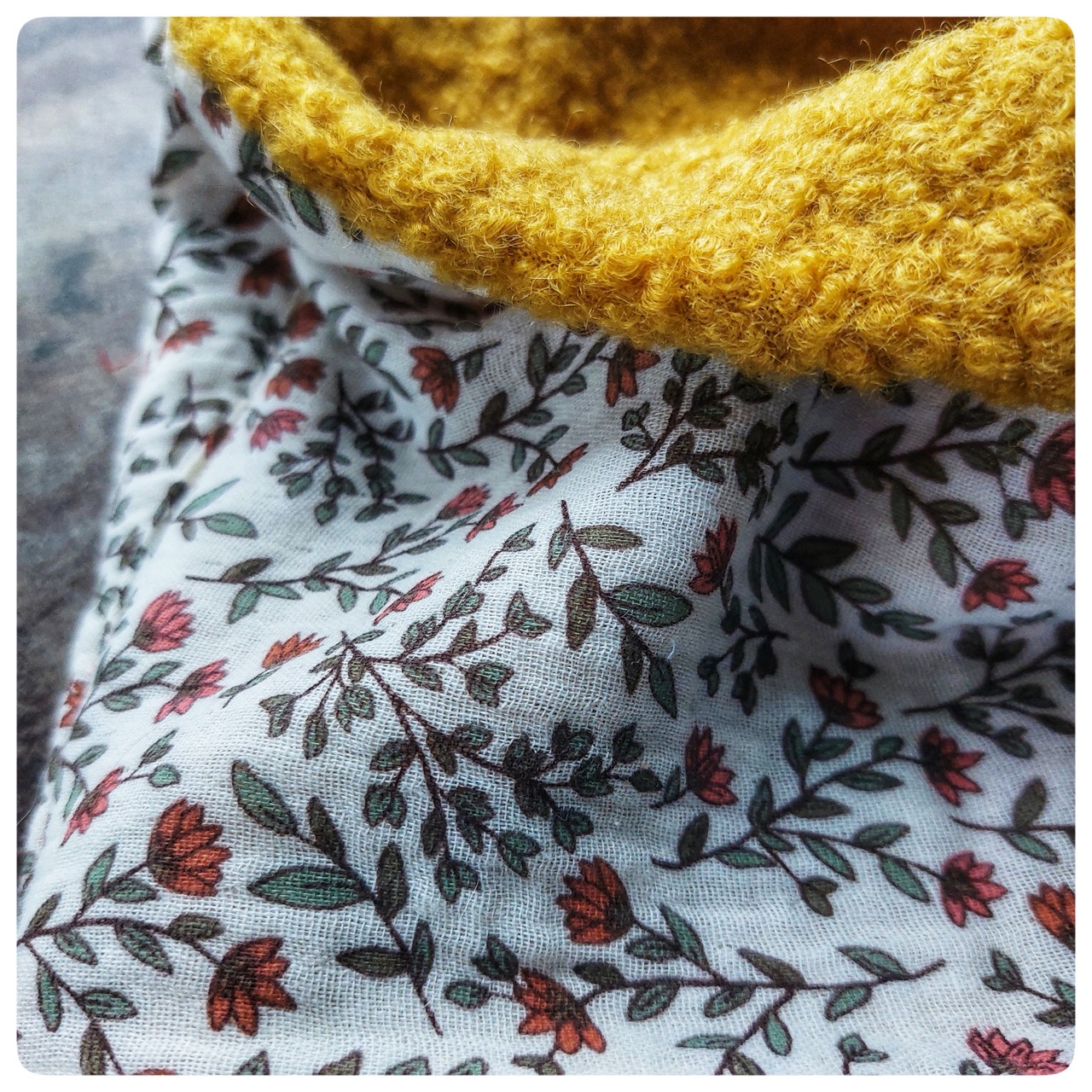 Snood pour enfant en tissu gaz de coton fleuris et fourreau jaune foncé